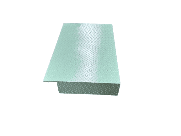 こちらは、設備業界向けに当社が製作した側溝カバーです。材質にはSS材(チェッカープレート t4.5、アングル材 L6×50×50)を使用し、レーザー切断、ベンダー曲げ、溶接、塗装の各工程を経て仕上げています
